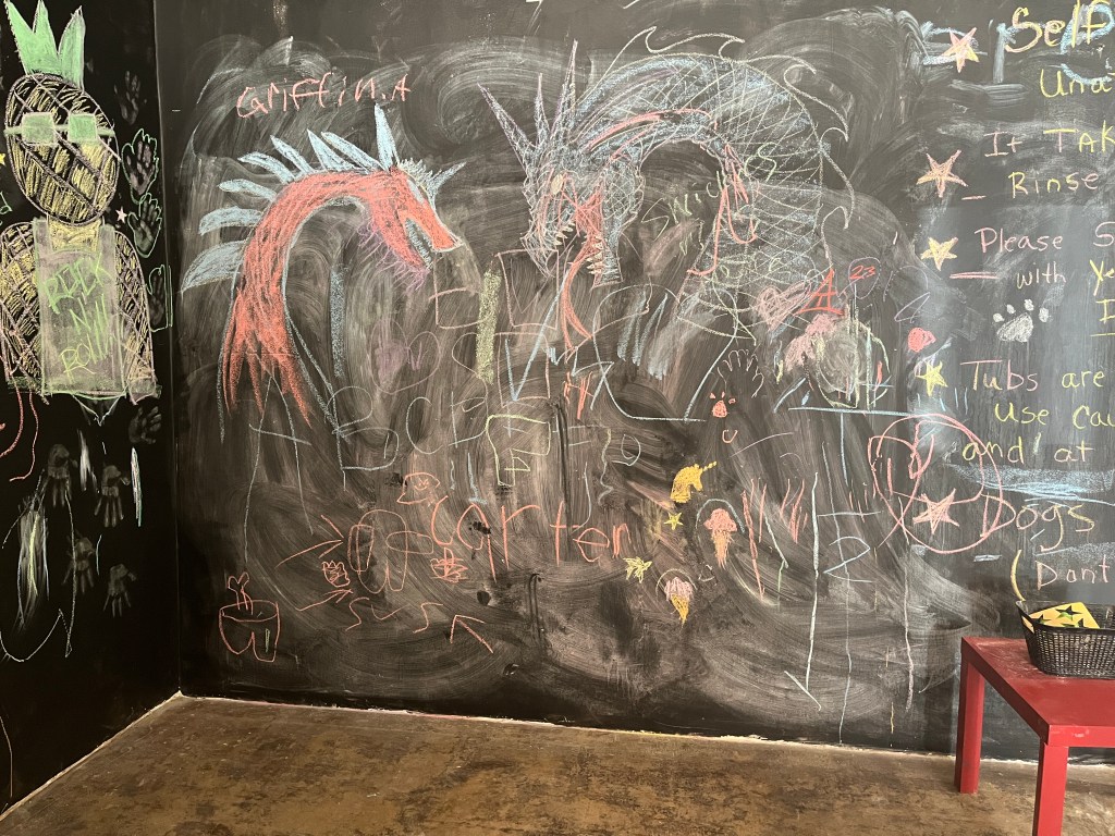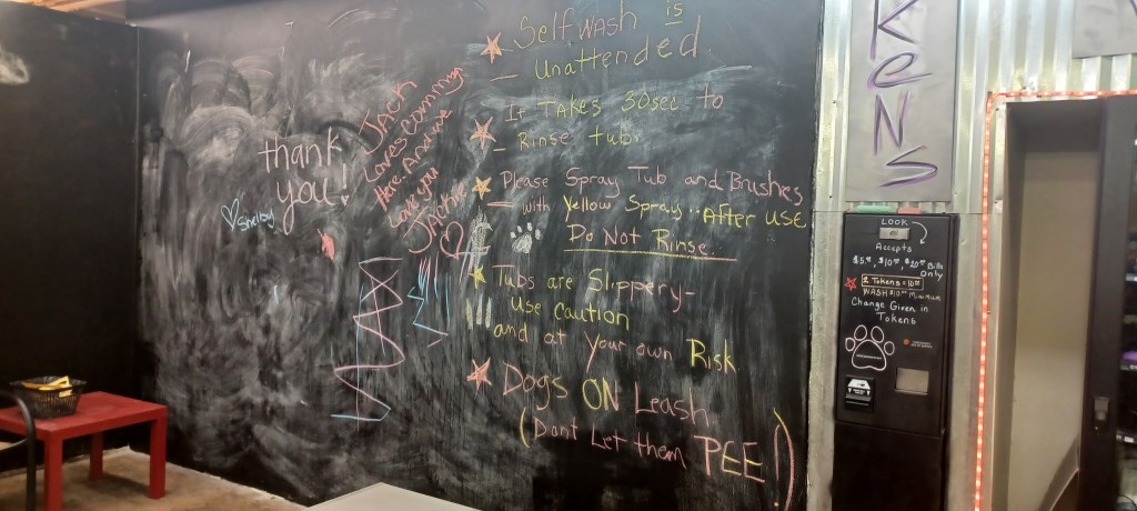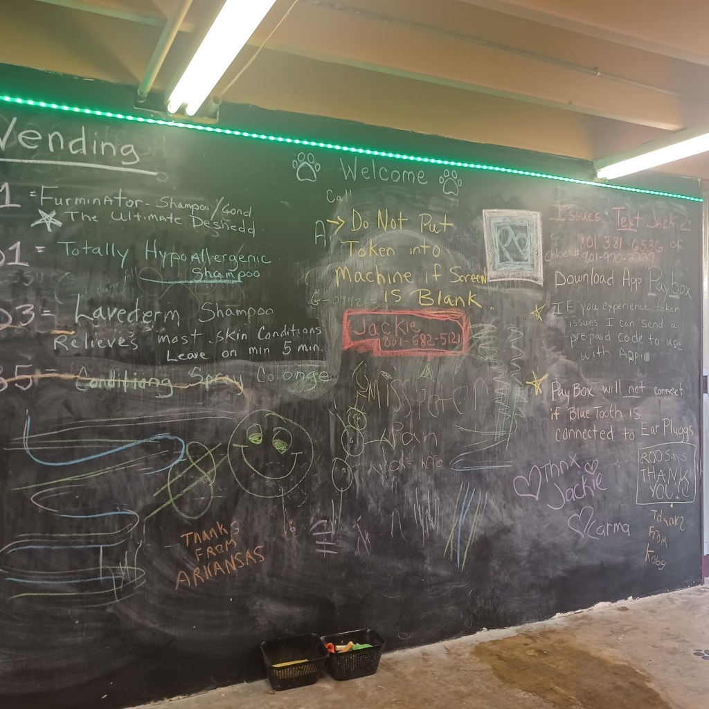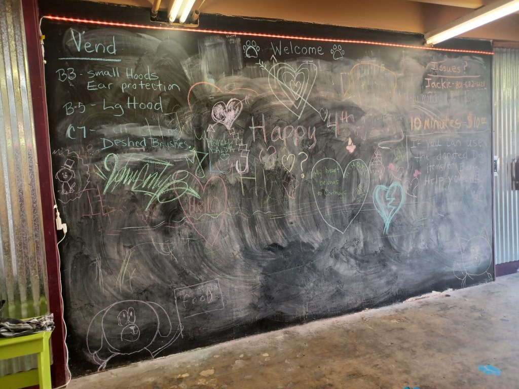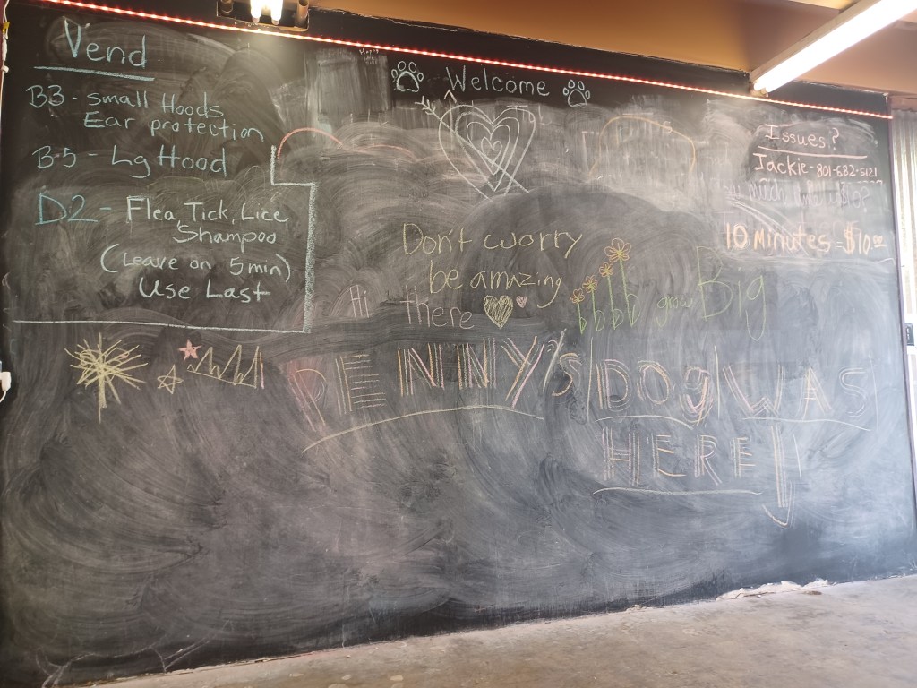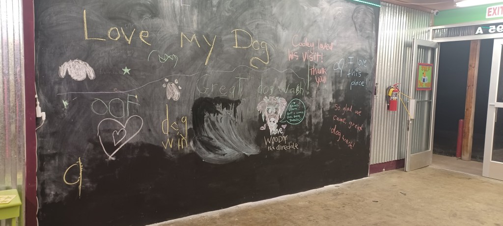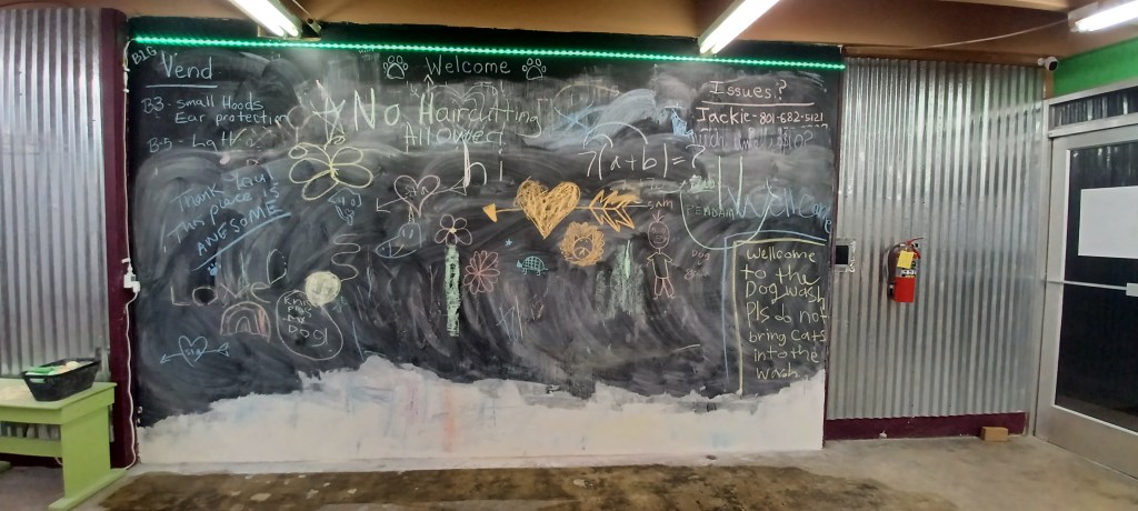 I added a blackboard to the self wash because I had a very ugly wall that I couldn’t figure out what to do with. I pictured parents washing dogs and a place to distract kids. I pictured love messages too. It’s been so much fun coming in and seeing all the wonderful messages of love and peace. I take a photo before I wash the board