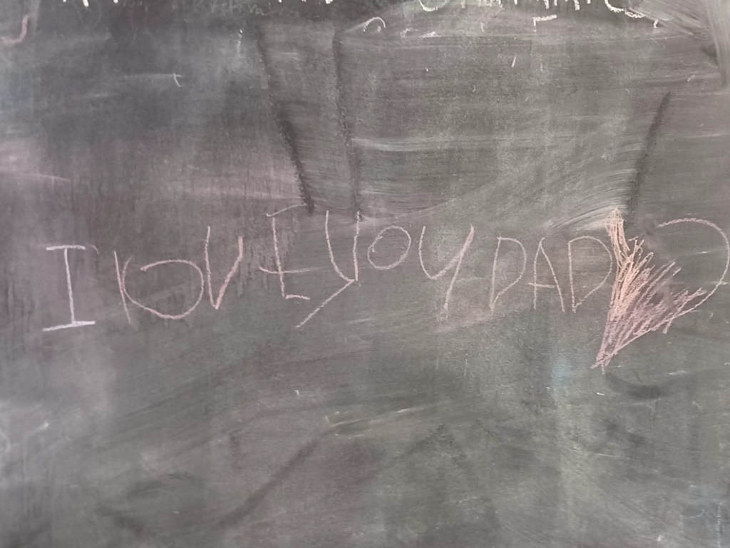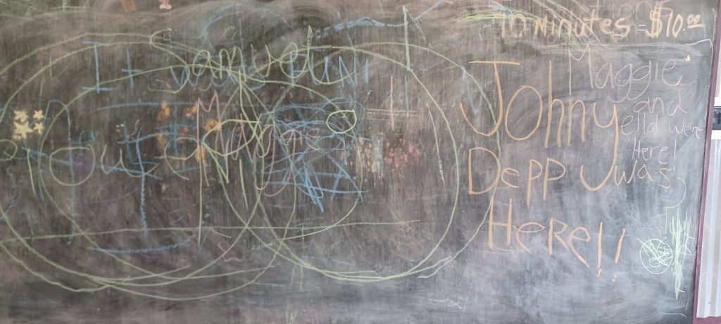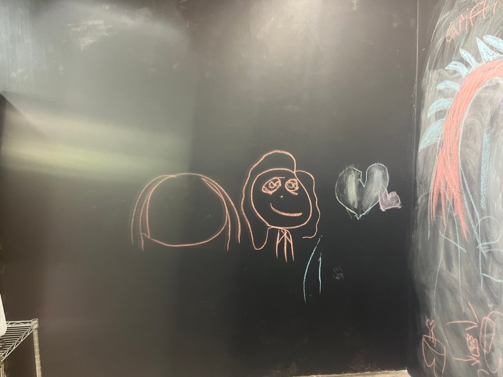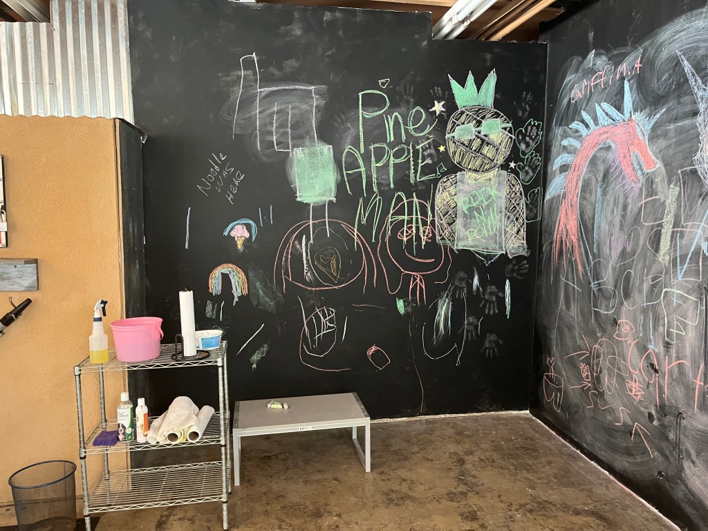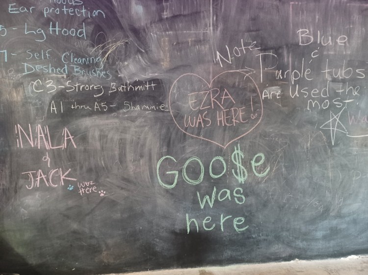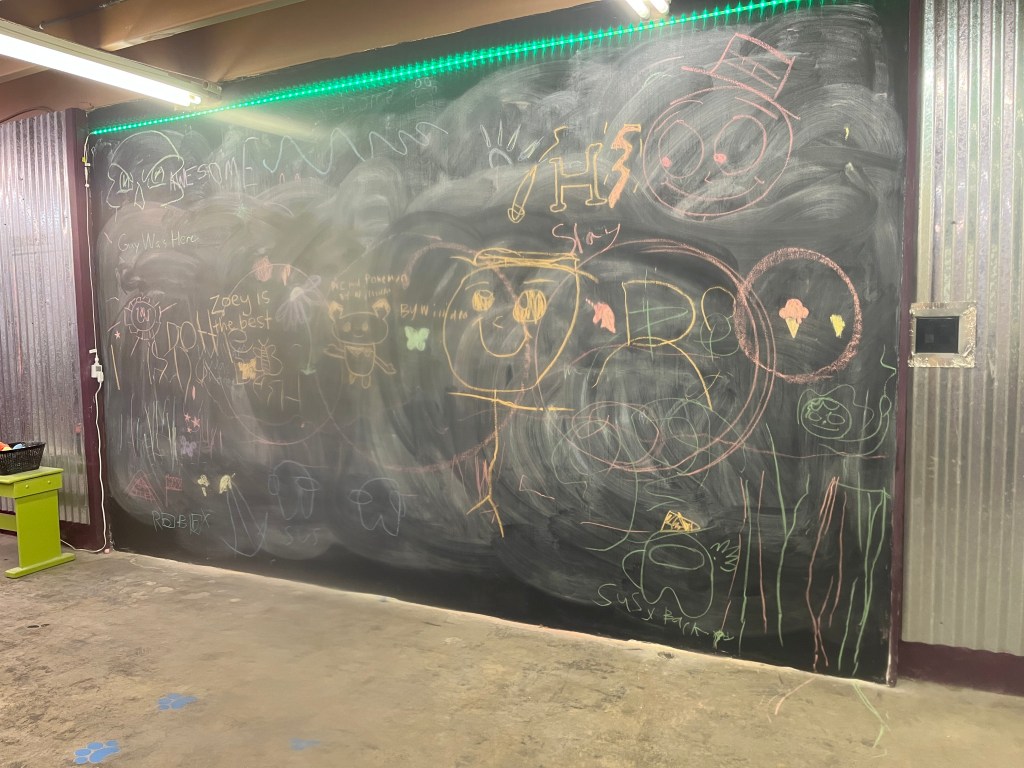 I added a blackboard to the self wash because I had a very ugly wall that I couldn’t figure out what to do with. I pictured parents washing dogs and a place to distract kids. I pictured love messages too. It’s been so much fun coming in and seeing all the wonderful messages of love and peace. I take a photo before I wash the board